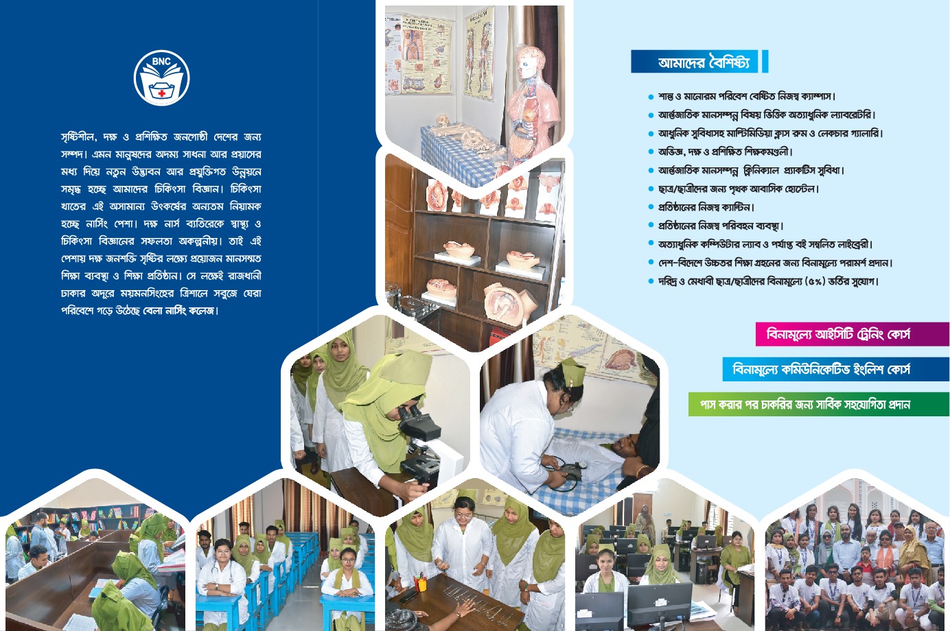 BNC offers a 4-year B.Sc. Nursing under the University of Dhaka, combining academic learning and clinical practice to prepare skilled nurses.
